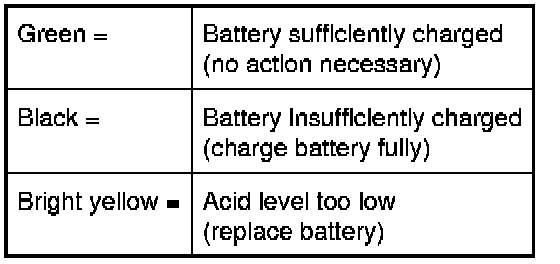 During each service-inspection or battery check, observe the color of the hydrometer and proceed as follows: