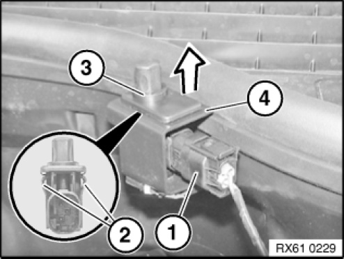 Unlock catches (2) with a suitable tool and guide bonnet/hood contact switch (3) in direction of arrow out of holder (4).