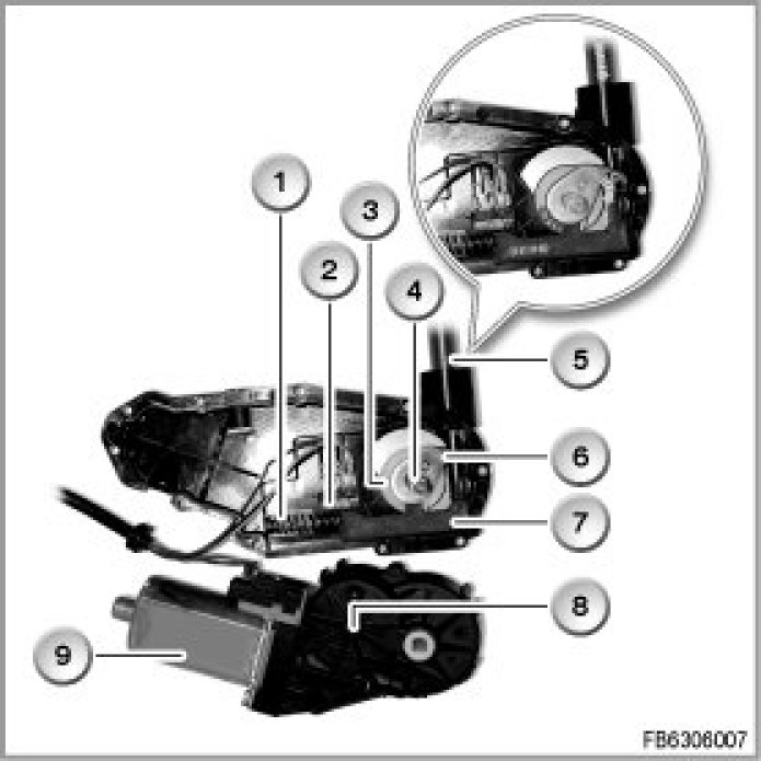 The drive for the trailer coupling release consists of a direct current motor and a reduction gear. The following components are integrated in the release unit: