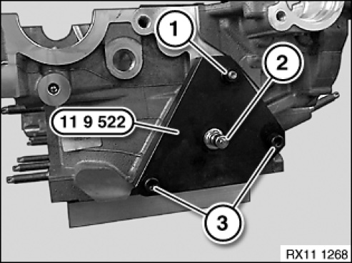 Screw special tool 11 9 522 into place with existing screws (1 and 3) of coolant thermostat.