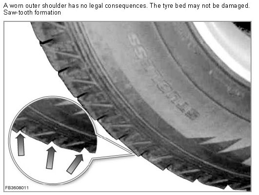 At the front tyres of rear-drive vehicles, a saw-tooth-shaped wear can be partially seen. The individual blocks wear due to the slip which occurs when lifting up from the road surface due to the unloading of the inner tension. Saw-tooth-shaped wear can have an increased running noise as a result.