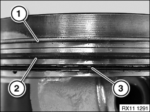 Offset the contact points (1) of the piston rings by approx. 120° to each other but do not position above the gudgeon pin boss.