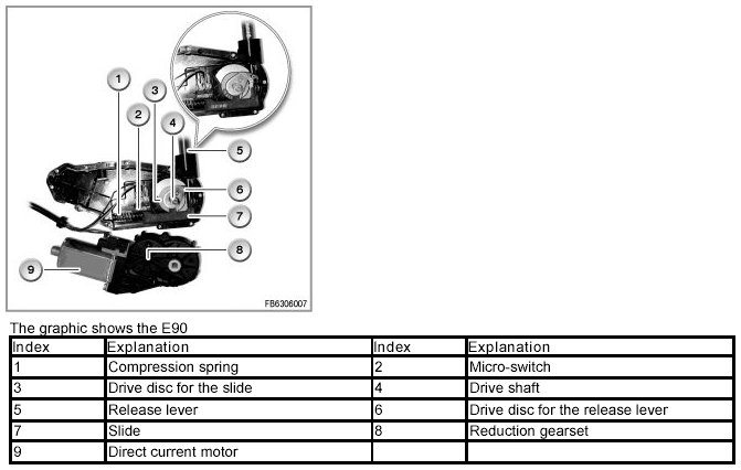 The drive for the trailer tow hitch release consists of a direct current motor and a reduction gear. The following components are integrated in the release unit: