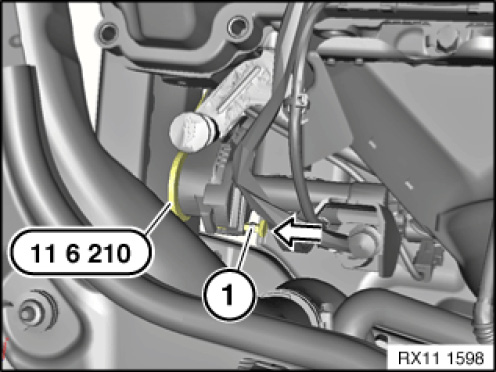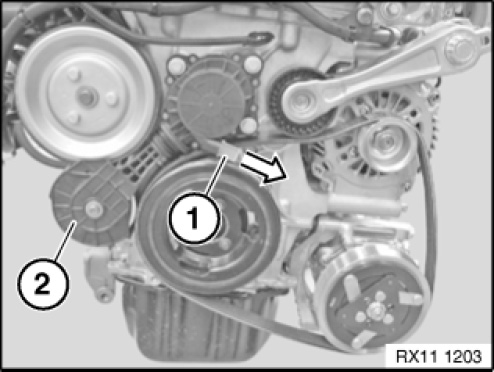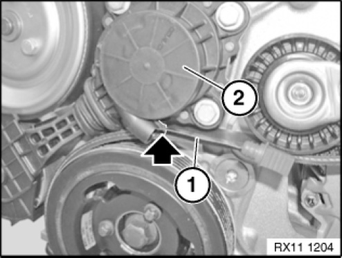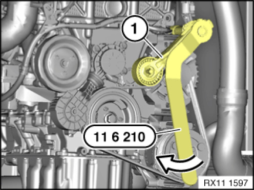 Bring belt tensioner (1) into assembly position in direction of arrow using special tool 11 6 210.