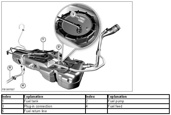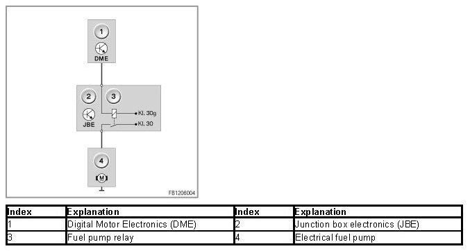 The electric fuel pump is an in-tank pump. The fuel pump relay activates the electric fuel pump. The DME control unit monitors the activation of the fuel pump relay. The fuel pump relay is controlled via a safety circuit only when the engine is running and shortly after terminal 15 ON for pressure build-up (delivery line for fuel pump). The fuel-pump relay is in the junction box.
