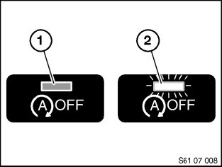 The automatic engine start-stop function can be deactivated manually with the ASSF button (1). The automatic engine start-stop function is activated with every terminal change (terminal 15 on) and with the engine stationary or if the ASSF button (1) is pressed repeatedly. The signal from the ASSF button (1) is read in by the IHKA and passed on to the engine control. The indicator light in the ASSF button (1) is actuated by the IHKA.