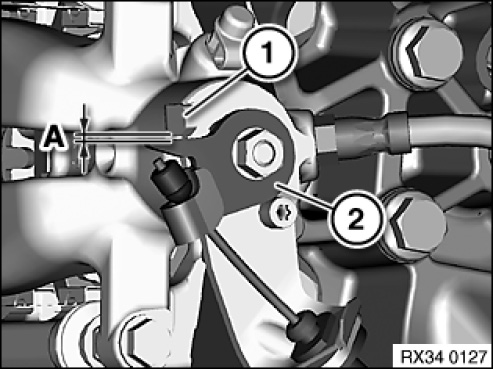Screw in adjusting nut on parking brake lever until a gap (A) of 0.5-1.5 mm between parking brake lever (2) and stop (1) is set at brake calipers.
