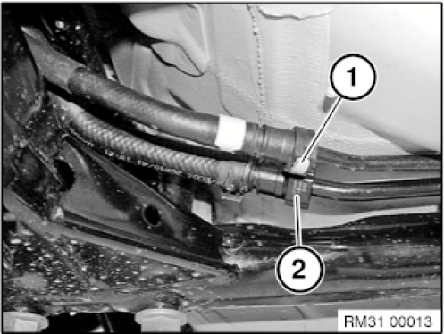 Unlock and detach fuel delivery and return line (1 and 2).