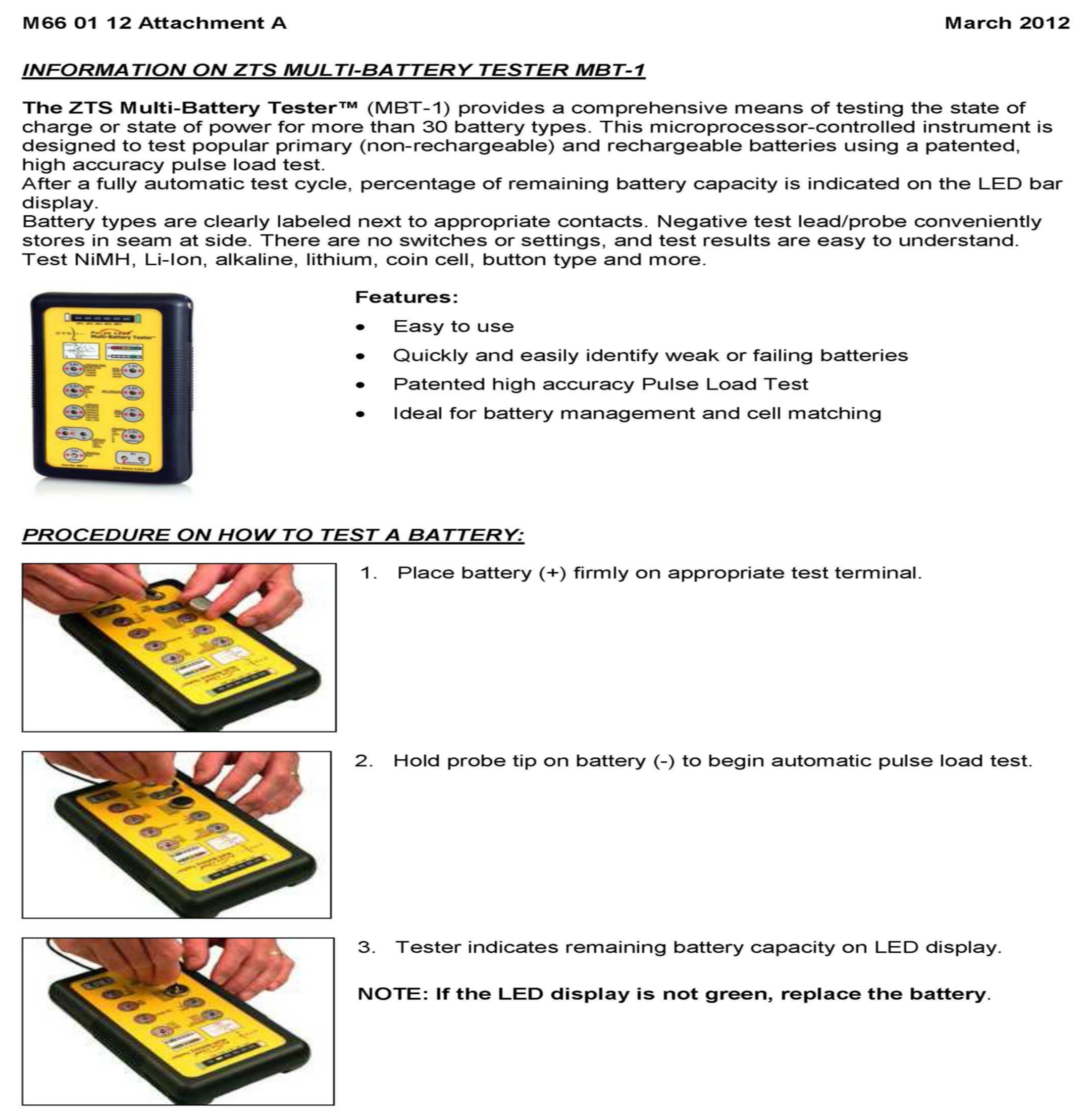 [NEW] More details on the ZTS Multi-Battery Tester MBT-1 can be found in Attachment A and on the ZTS manufacturer website, www.ztsinc.com/mbtl.html.