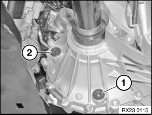 Unscrew filler/fluid level monitoring connector (2) and fill gearbox until oil overflows. Allow excess oil to drain and reinstall filler/fluid level monitoring connector.