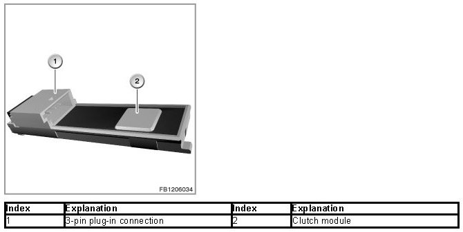 On vehicles with manual gearboxes, the clutch module at the clutch pedal picks up the clutch position (clutch pressed: clutch switch open; clutch not pressed, clutch switch closed). The clutch module consists of a clutch switch and an electronic evaluation unit.