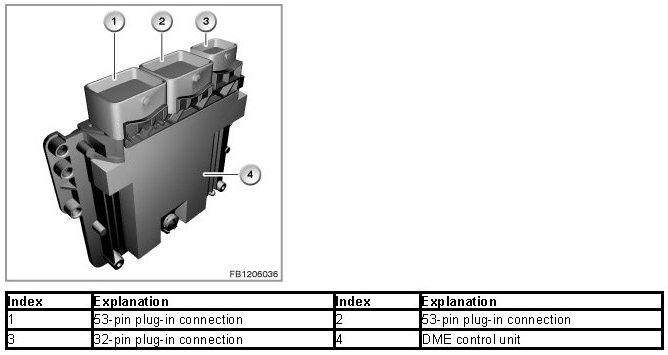 The DME control unit is connected with the vehicle electrical system via the engine wiring harness and vehicle wiring harness (3 connector chambers).