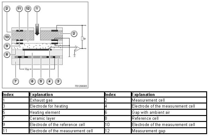 The sensor system of the broadband oxygen sensor consists of ceramic layers of zirconium dioxide (laminate). The heating element inserted in the laminate rapidly ensures the required operating temperature of at least 750 ° C. The broadband oxygen sensor has 2 cells, a so-called measurement cell and a reference cell. The two cells are coated with electrode made of platinum.