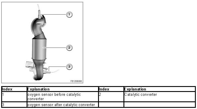 The front oxygen sensor continuously measures the residual oxygen in the exhaust gas. The fluctuation values of the residual oxygen are forwarded to the DME control unit as a voltage signal. The DME corrects the mixture composition by means of fuel injection. A second oxygen sensor (monitoring sensor) is built in behind the catalytic converter. The catalytic converter has a high oxygen accumulation capability. This means there is only a little air behind the catalytic converter. The monitoring sensor supplies a virtually constant (attenuated) voltage. With increasing age, the oxygen accumulation capability of the catalytic converter declines. The control sensor then reacts increasingly to lambda deviation with voltage fluctuations. These characteristics are used by a special diagnosis function for catalytic converter monitoring. A malfunction of the catalytic converter is indicated by the emissions warning lamp.