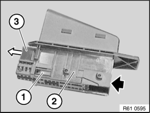 Raise locking slide (1) on both sides (2) of housing and detach.