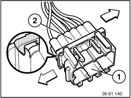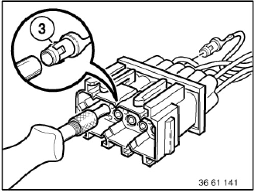 With special tool 61 1 132 (press-out tool) press back arrester hook (3) of appropriate contact and pull out cable with contact.