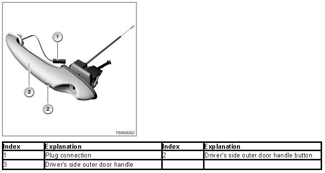 The outer door handle buttons are connected to the Comfort Access control unit. Pressing the button starts an authentication procedure (= check for authorized ID transmitter).