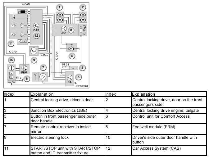 The junction box electronics are the executing control unit for the central locking system. The JBE assumes responsibility for activating all central locking drives. For example, if the CAS control unit authorizes the unlocking of the vehicle, the doors are unlocked. The JBE also supplies the Comfort Access control unit using the closed-circuit current cut-off relay.