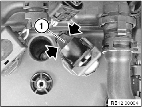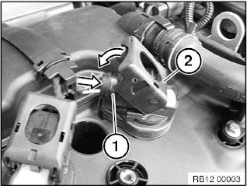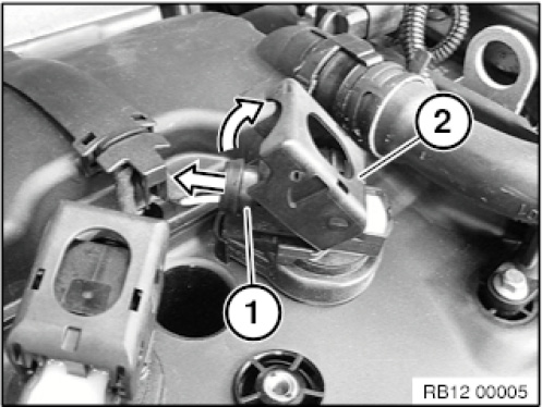 Unlock the plug latch mechanism (2) of the ignition coil and pull disconnect the connector (1).