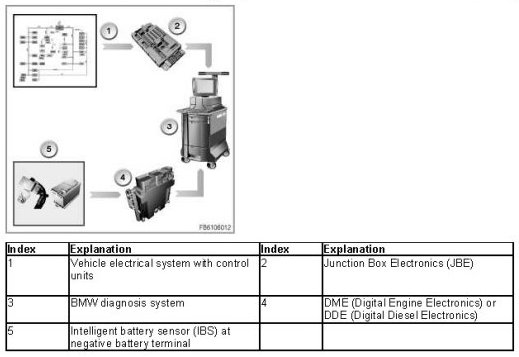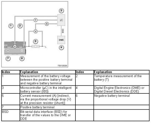 If an intelligent battery sensor is fitted, the DME/DDE will evaluate the current battery condition. The DME/DDE therefore also influences the closed-circuit current cutoff relay.
