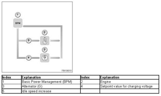 With the engine running, the alternator generates a variable charging voltage for battery charge. The variable charging voltage is influenced by the power management depending on the temperature and current by the DME/DDE raising the engine speed.