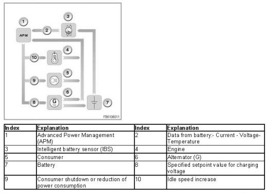 The power management a subsystem of the energy management. The power management is run from the engine control unit (DME or DDE: Digital Engine Electronics or Digital Diesel Electronics). While driving, the power management system adjusts the power of the alternator and battery charging.