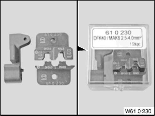 (Matrix for contacts "DFK 40" and "MAK 8") For crimping contacts when replacing interior fuse box (up to model year 09/2005) and for further applications.