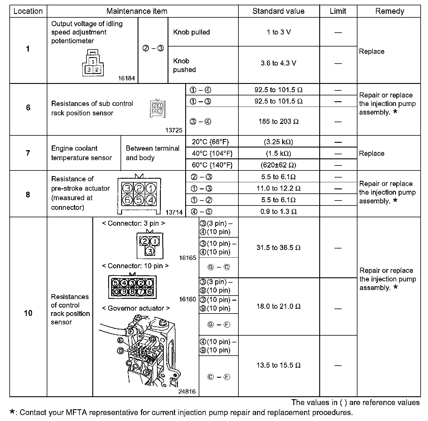 - If any resistance is out of specification, replace the sub control rack position sensor 6.