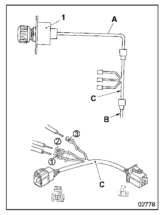 - Disconnect the harness A of the idling speed adjustment potentiometer 1 from the cab-side harness B. Then, connect an inspection harness C between harnesses A and B. (The inspection harness must be made specially for this procedure.)