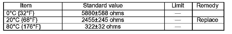 - At each of the specified temperatures, measure the resistance between the terminal (1) and body of the engine water temperature sensor 7.