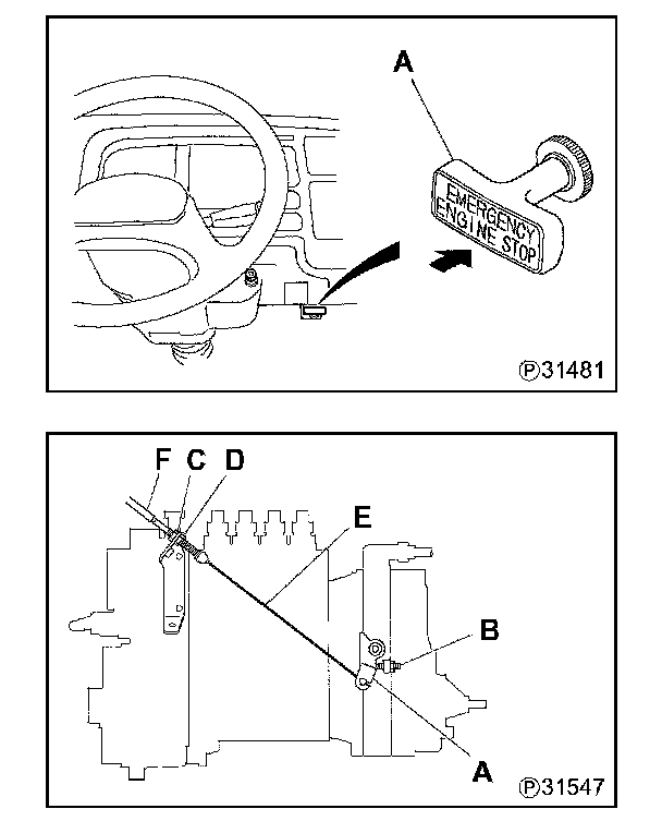 - Inner wire E of stop cable F should be taut. If not, make adjustment.