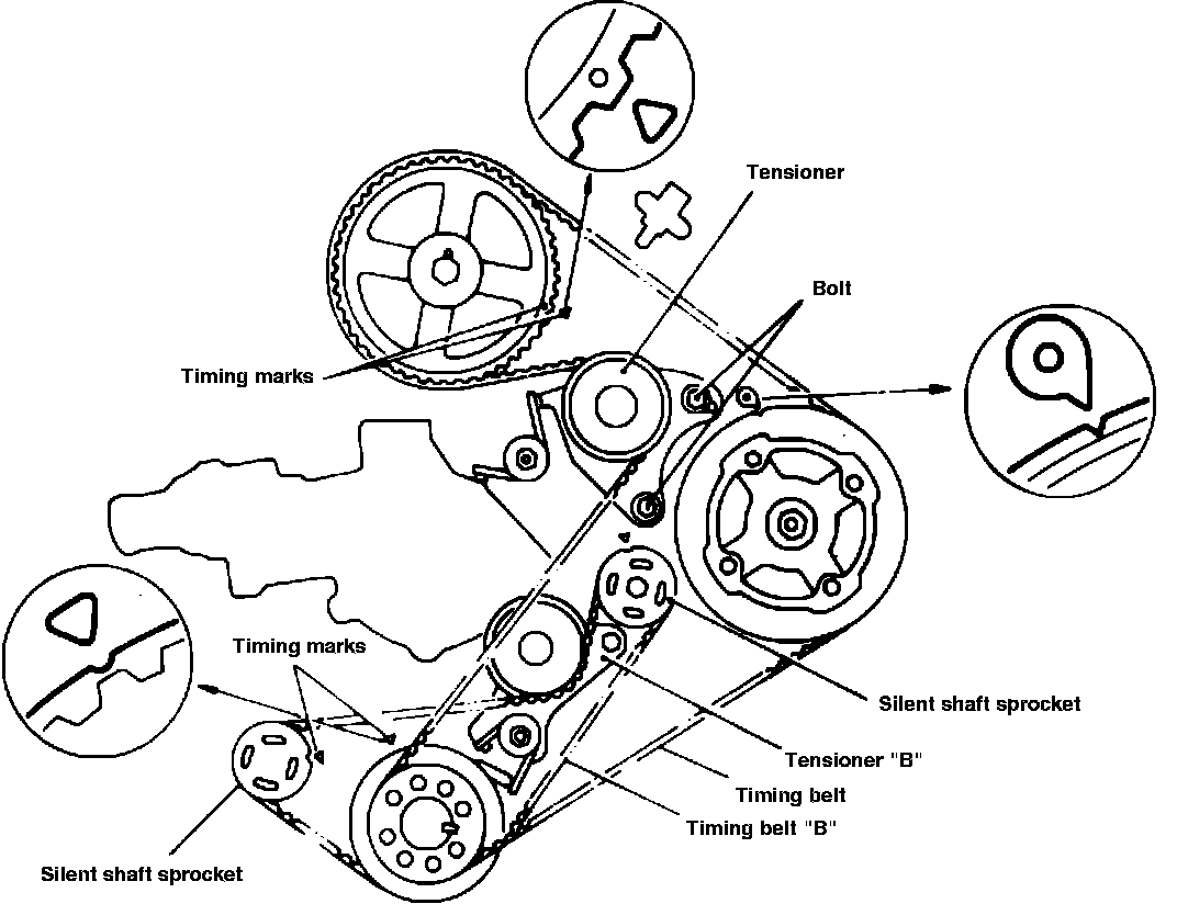 8. Place tensioner B against timing belt B so belt has slight spring tension. Tighten tensioner B nut and bolt. Tighten nut first, then bolt.
