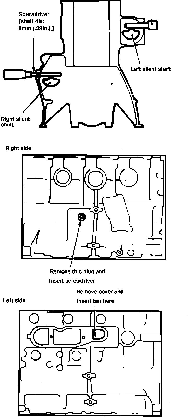 5. Reverse procedure to install. Install crankshaft sprocket B, flange and sprocket as shown in Fig. 4. Install injection pump sprocket and install flange to injection pump sprocket, Fig. 5. Install spacer on left silent shaft with chamfered end toward oil seal. Tighten silent shaft sprockets nut and bolt with shafts held in position as shown in Fig. 3.