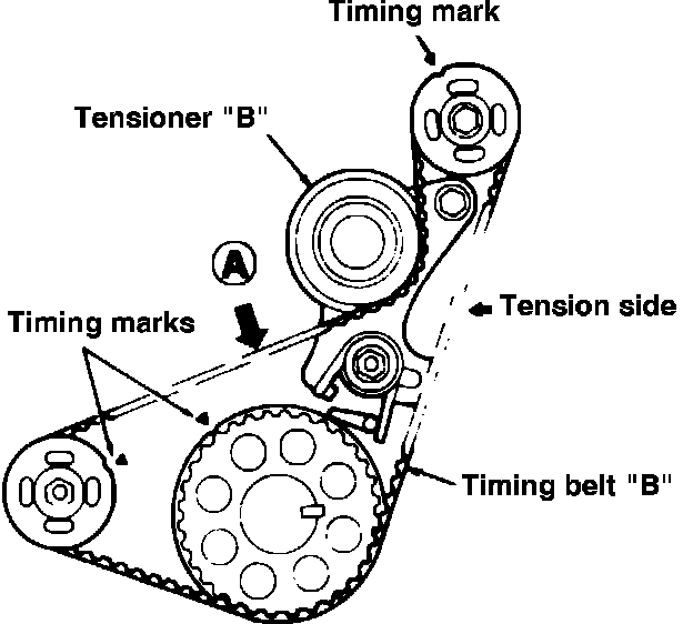 7. Align timing marks of silent shaft sprockets and crankshaft sprocket. Install timing belt B with no slack on tension side. Push down on B belt with finger at point A as in Fig. 6.
