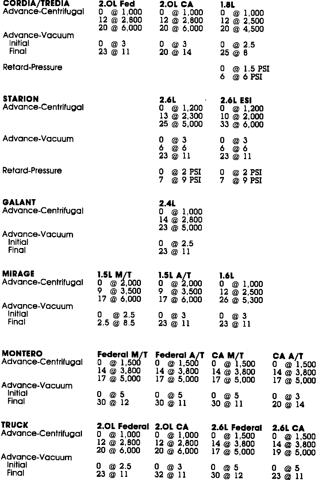 In addition, advance data tor the 1985 Truck and Montero have been changed, and vacuum advance data for Galant and Cordia/Tredia have also been revised.
