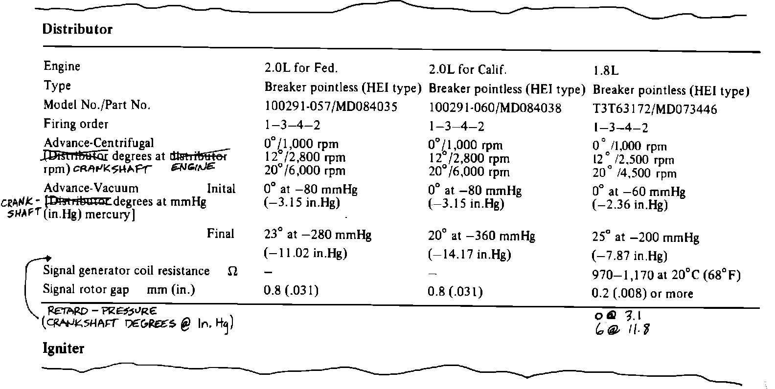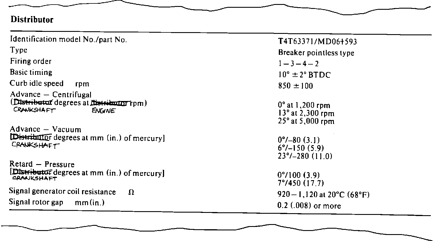 Revise distributor timing specifications as shown below.