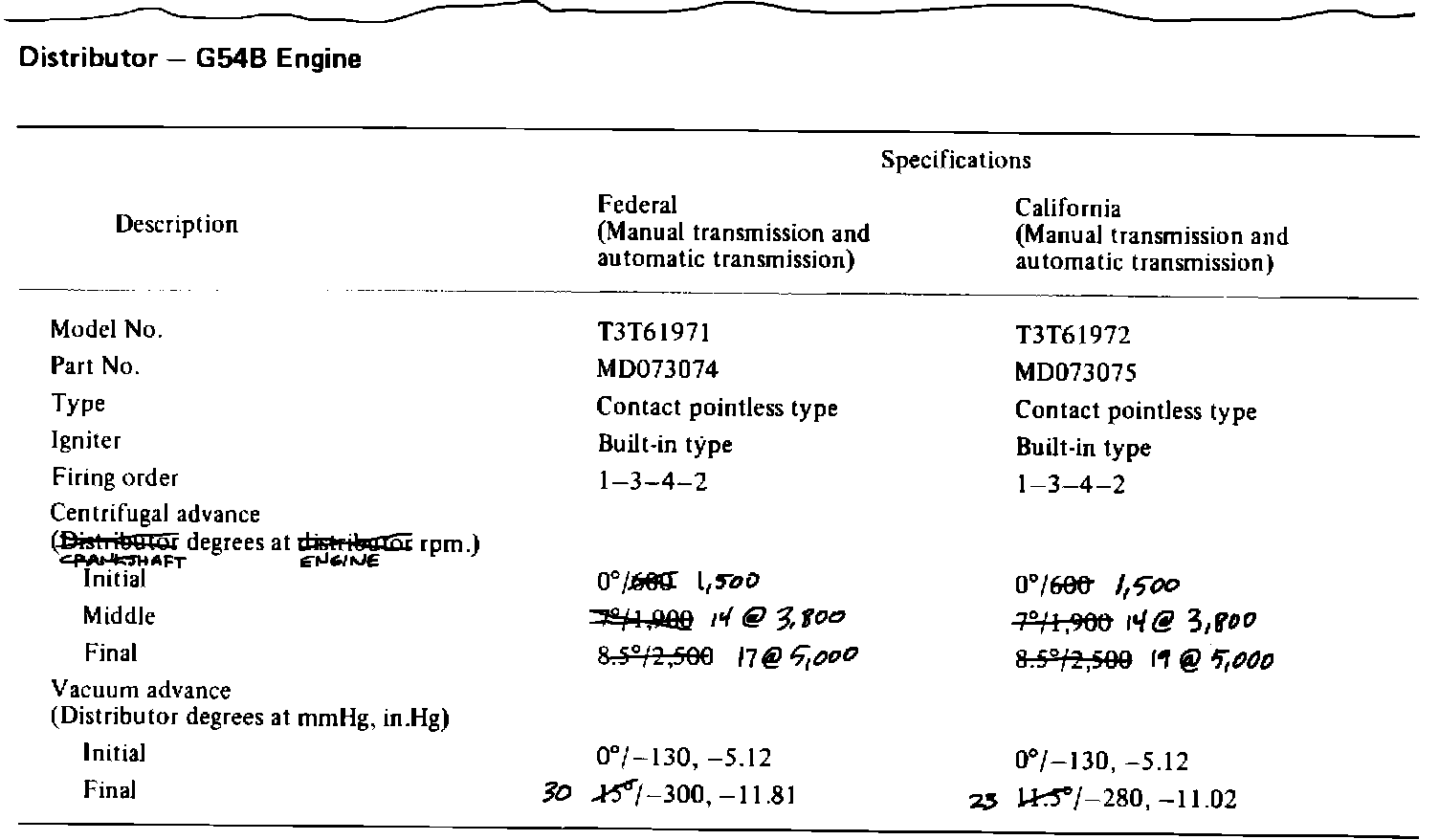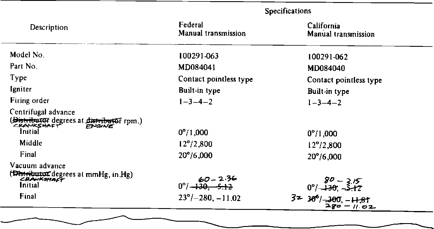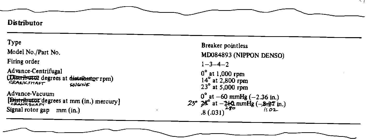Distributor timing specifications, formerly given in "Distributor degrees" and "Distributor rpm" have been converted to "Crankshaft degrees" and "Engine rpm". This change has been made because distributor test equipment commonly used by MMSA dealers measures crank angles and engine speed.