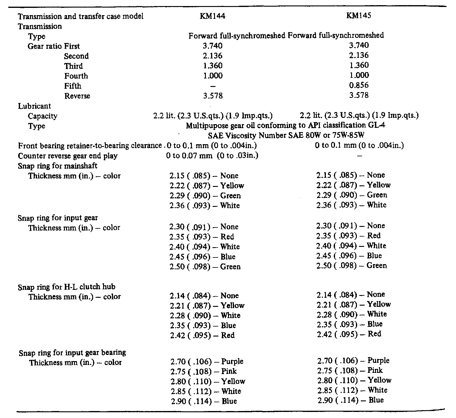 KM144/KM145 M/T, Gear Ratios & Standard Values: