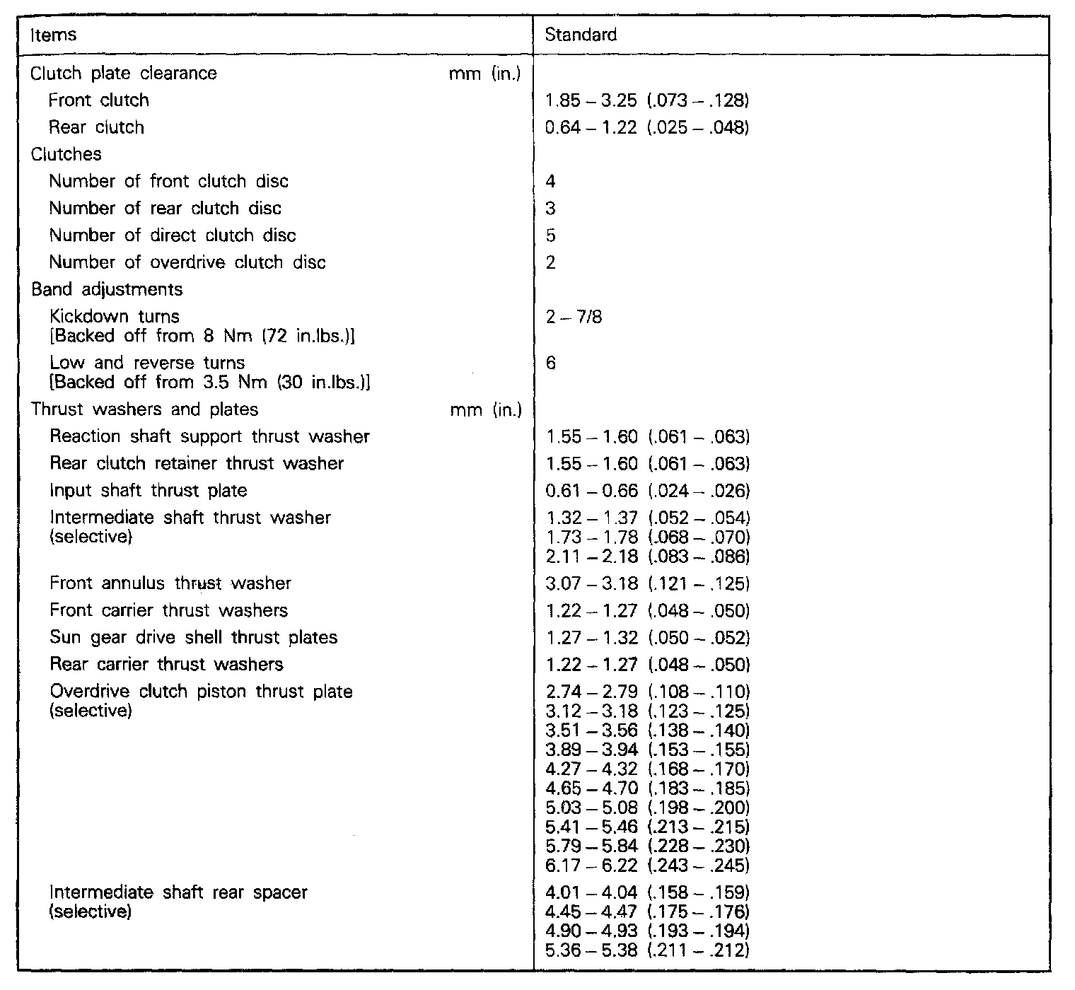 R4AC1 4-spd A/T, Transmission Standard Values: