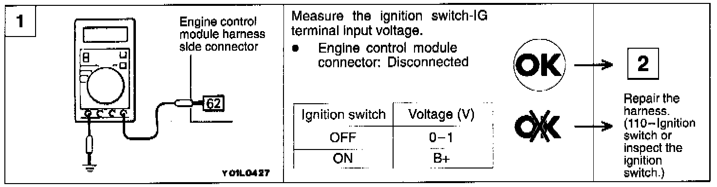 3. Measure the voltage at terminal (1) of the MFI relay while connecting and disconnecting the jumper wire to the negative battery terminal.
