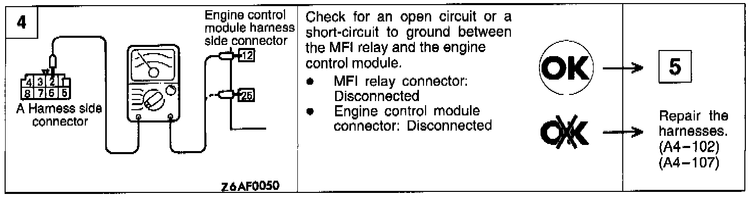 5. Check for continuity between terminal (2) and terminal (4), and terminal (3) and terminal (4) of the MFI relay while connecting and disconnecting the jumper wire and the negative battery terminal.