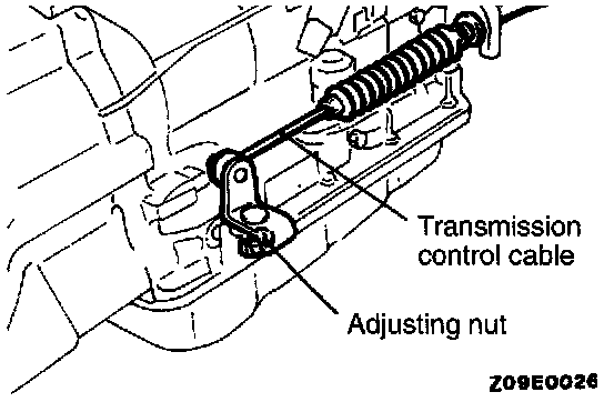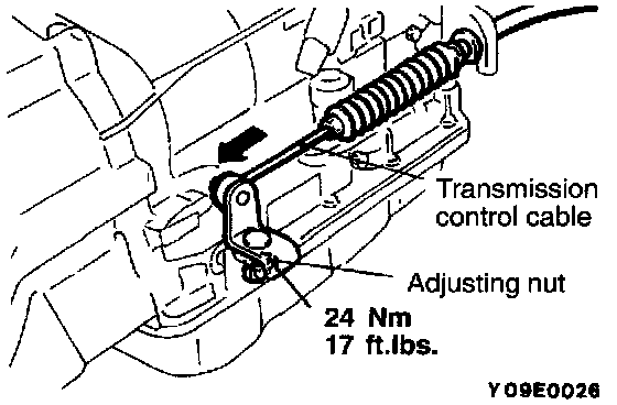 6. Gently pull the end of the transmission control cable in the direction of the arrow and tighten the adjusting nut to the specified torque.