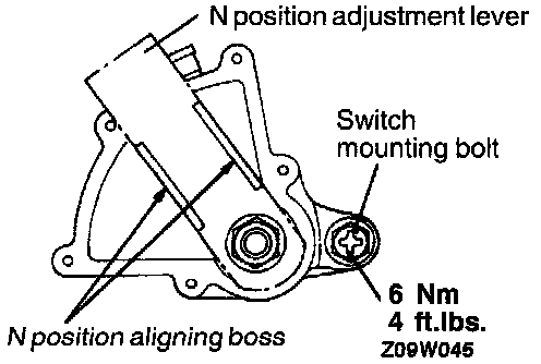 4. Adjust by turning the park/neutral position switch so that the bosses for aligning the N position on the park/neutral position switch are aligned with the N position adjustment lever.