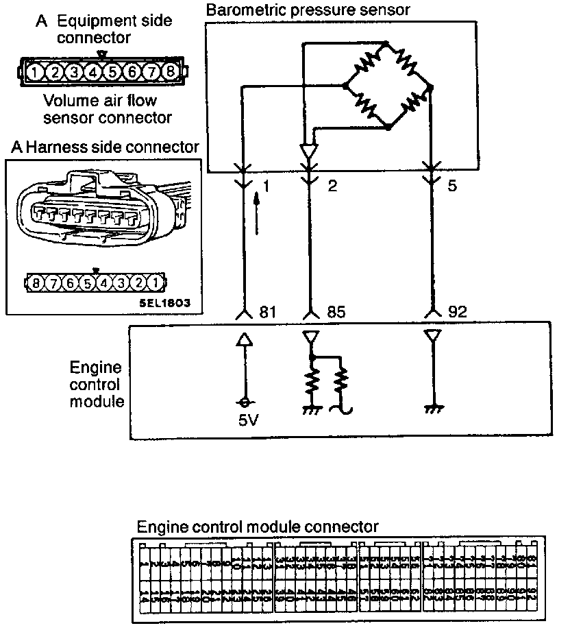 STEP 2. Check for an open or short-circuit between the barometric pressure sensor and the engine control module.