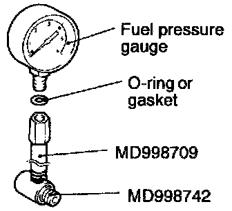 3. Connect a fuel pressure gage to the special tool, placing an adequate O-ring or gasket between the gage end special tool prevent fuel leaks.