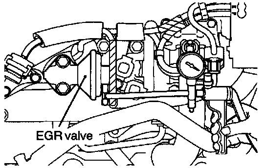 1. Disconnect the green striped vacuum hose from the EGR valve, and using a three-way terminal, connect a hand vacuum pump as shown.