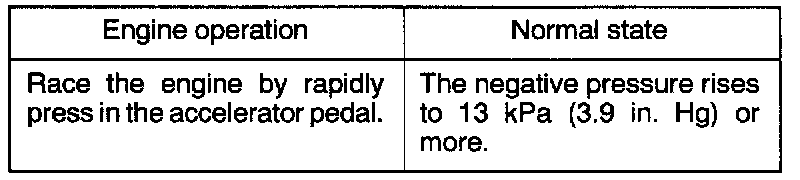 4. When a negative pressure of 31 kPa (9.1 in.Hg) is applied during idling, check that the engine stops or idles unstably.