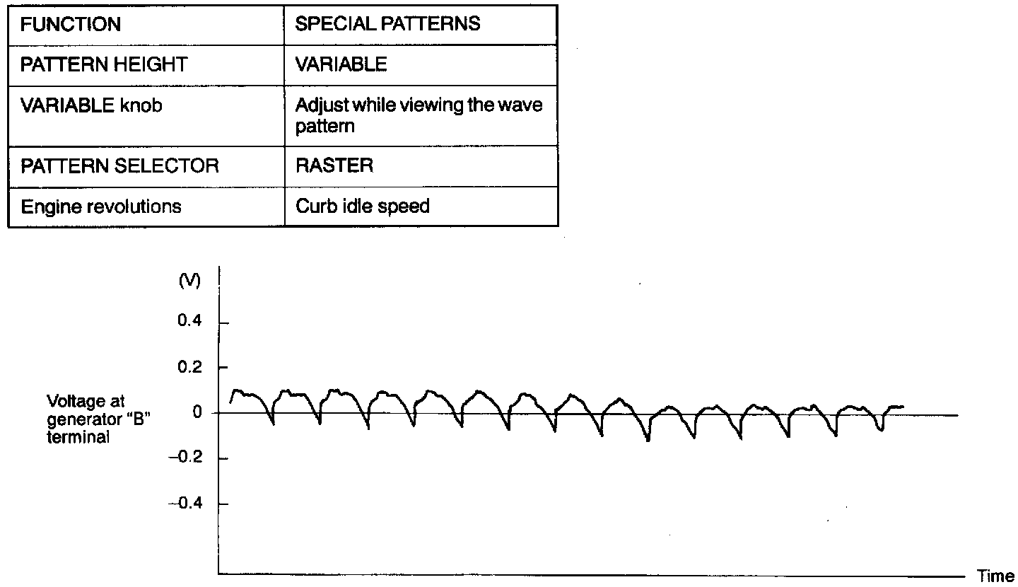 NOTE: Furthermore, the voltage waveform of the generator B terminal can undulate as shown at left. This waveform is produced when the regulator operates according to fluctuations in the generator load (current), and is normal for the generator.
