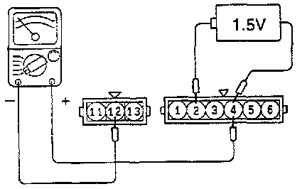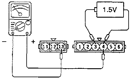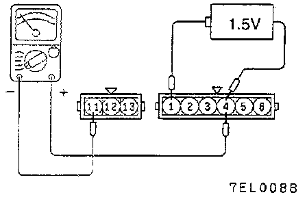 1. Connect the negative (-) terminal of the 1.5 V power supply to terminal (4) of the ignition power transistor and then check whether there is continuity between terminal (13) and terminal (4) when terminal (3) and the positive (+) terminal are connected and disconnected.