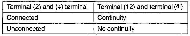 1. Connect the negative (-) terminal of the 1.5 V power supply to terminal (4) of the ignition power transistor, and then check whether there is continuity between terminal (12) and terminal (4) when terminal (2) and the positive (+) terminal are connected and disconnected.